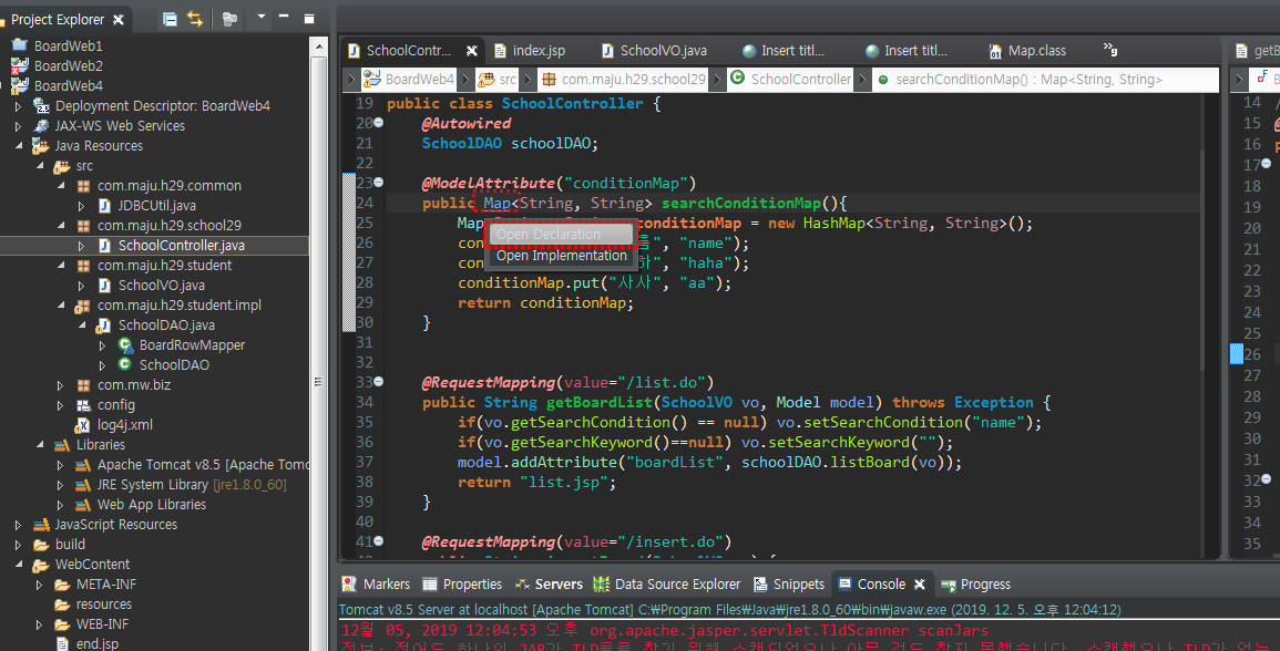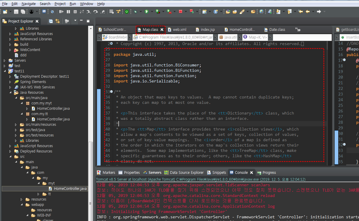 해당 클래스 앞에 ctrl 키를 누르고 클릭을하면 클래스 선언문으로 이동할 수 있다.