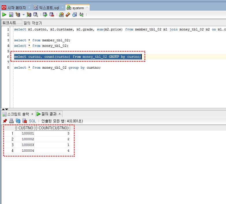 그렇기 그룹으로 묶은 custno 부분을 출력하고 각 custno이 몇개 있는지 count로 출력하도록해야 한다.