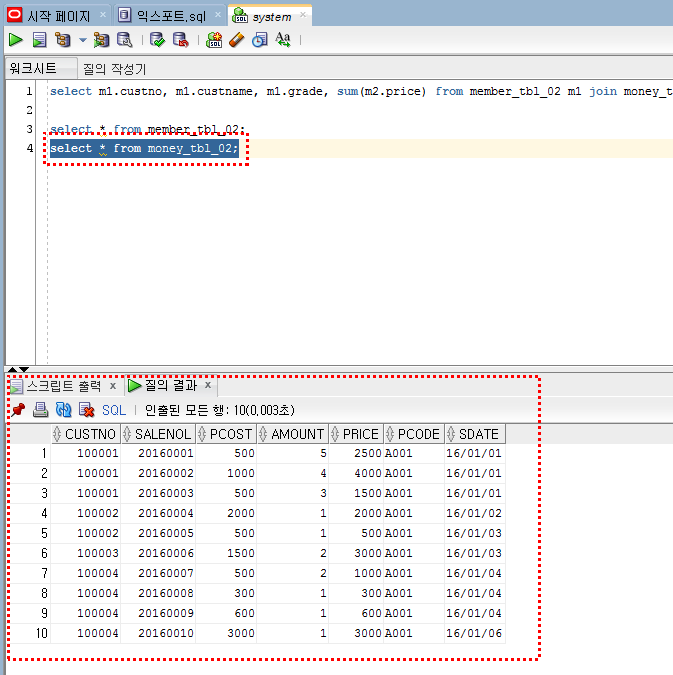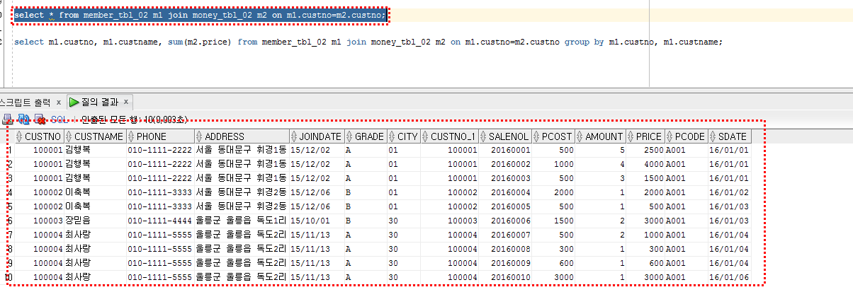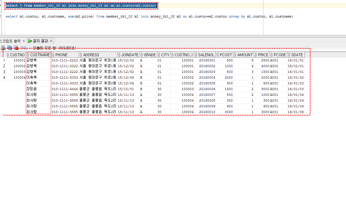 본인은 member_tbl_02(m1라고 부르겠다) money_tbl_02(m2라고 부르겠다) 두개의 테이블을 조인하여 Group by로 출력하고자한다.