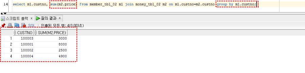 보다시피 sum(price)되어 아래와 같이 custno와 각 custno 별로 총 얼마의 price가 합해졌는지 확인할 수 있다.