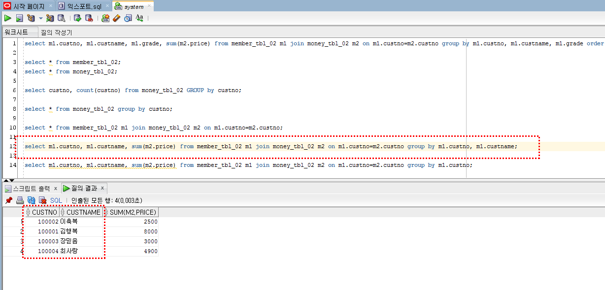 아래와 같이 custname도 group화를 하면 아래와 같이 정상 출력되는 것을 확인할 수 있다.