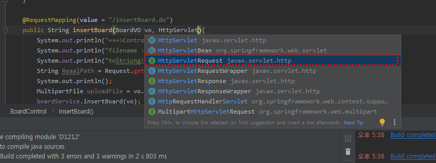 Ok를 누르면 아래와 같이 HttpServletRequest가 추가된 것을 확인할 수 있다.