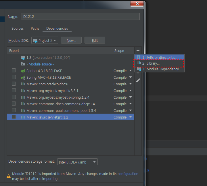 그리고 아래와 같이 Modules > D1212 > Dependencies > 우측에 +를 클릭한다.
