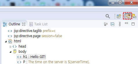 다음 화면과 같이 오른쪽에 GIT 퍼스펙티브를 클릭한다.