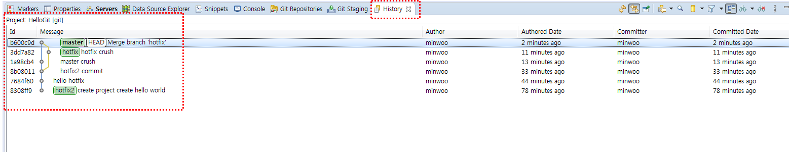 다음과 같이 history에서 커밋 내역 그래프를 볼 수 있다.