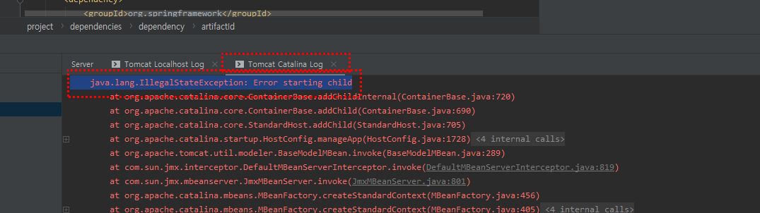 다음과 같이 의존성 추가 후 톰캣을 구동하였으나