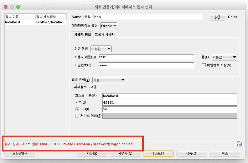 프로젝트에서 데이터베이스 접속을 하려고하니 아래와 같은 오류가 발생하였다. 위와 같이 db에서 오류가 발생하면 db 프로그램에서도 동일한지 확인이 필요하다. 오라클 sql developer에서 새 접속을 실행해본다..