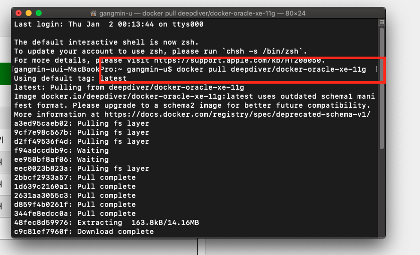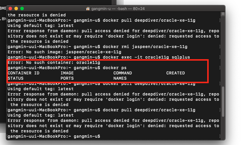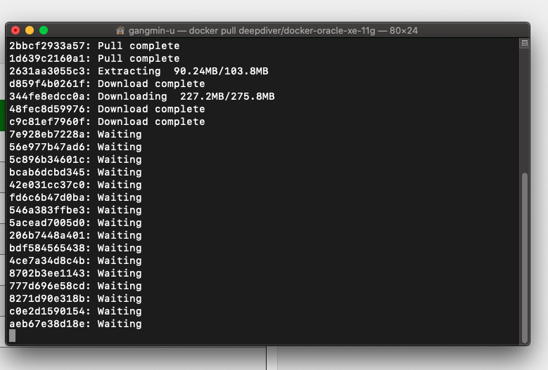 | 1 | docker pull deepdiver/docker-oracle-xe-11g(도커 허브에서 검색해서 다른 컨테이너로 다운받아도 됨) | deepdiver 유저의 oracle 11g 이미지를 받아옴 |