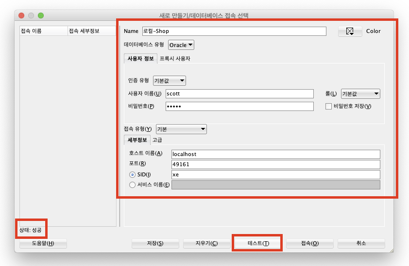 다음과 같이 새로 데이터베이스 정보를 입력하고 테스트를 진행하면 정상적으로 접속이 되는 것을 확인할 수 있다.