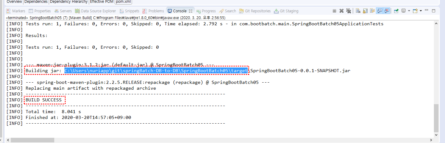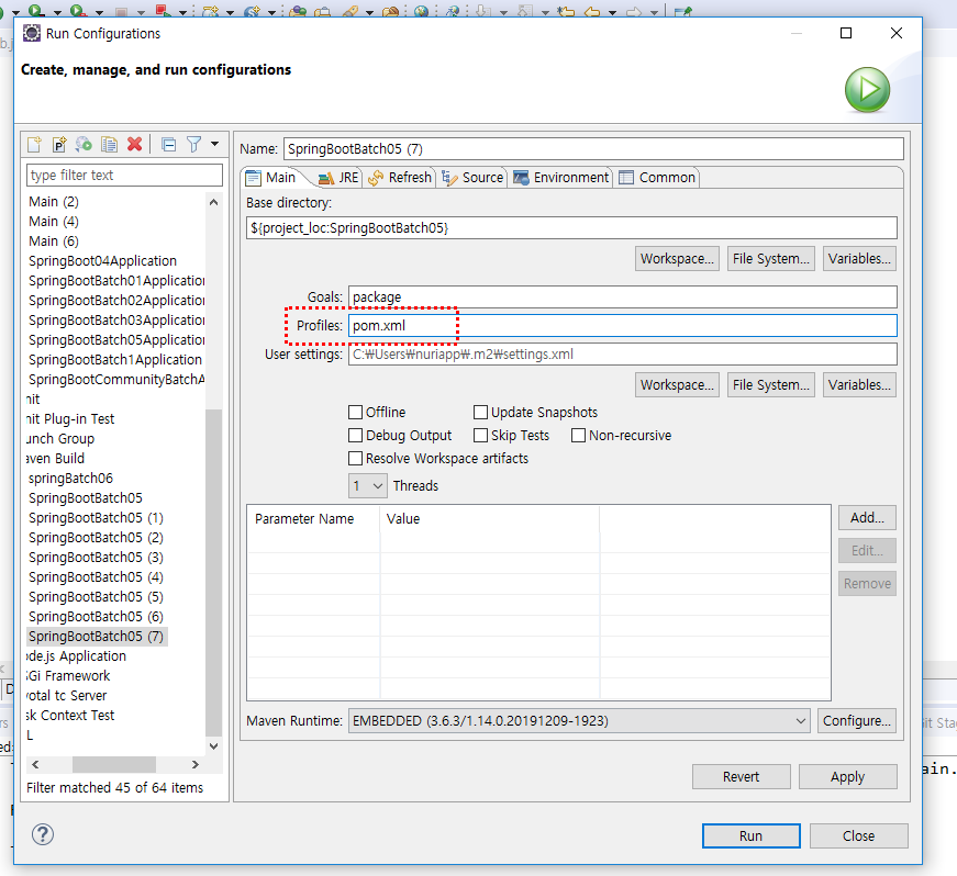 오류처리 : Run configuration의 profile에서 pom.xml 삭제 후 정상적으로 메이븐 빌드됨