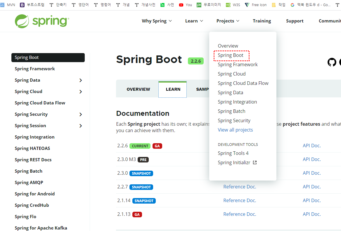 다음과 같이 확인 후 본인에게 맞는 스프링 부트 버전의 Reference Doc으로 이동한다.
