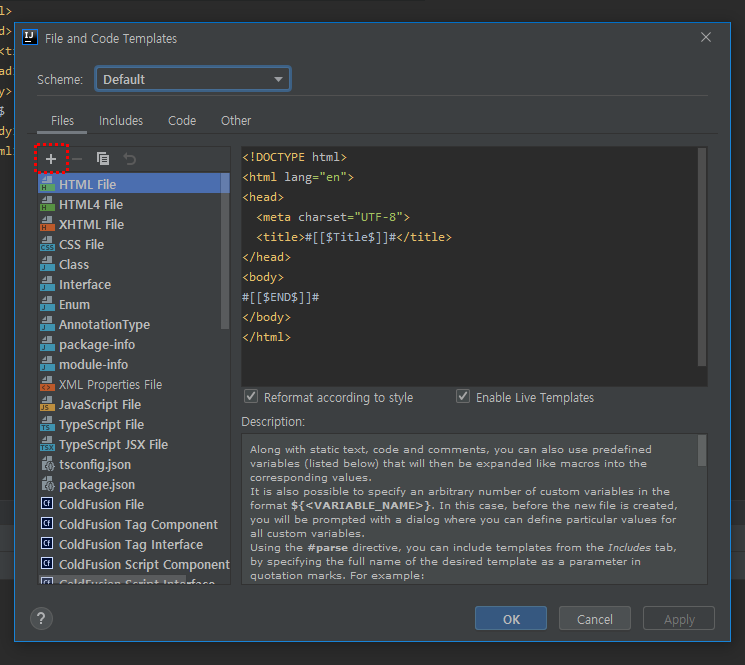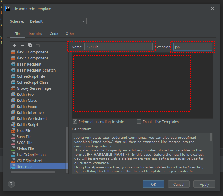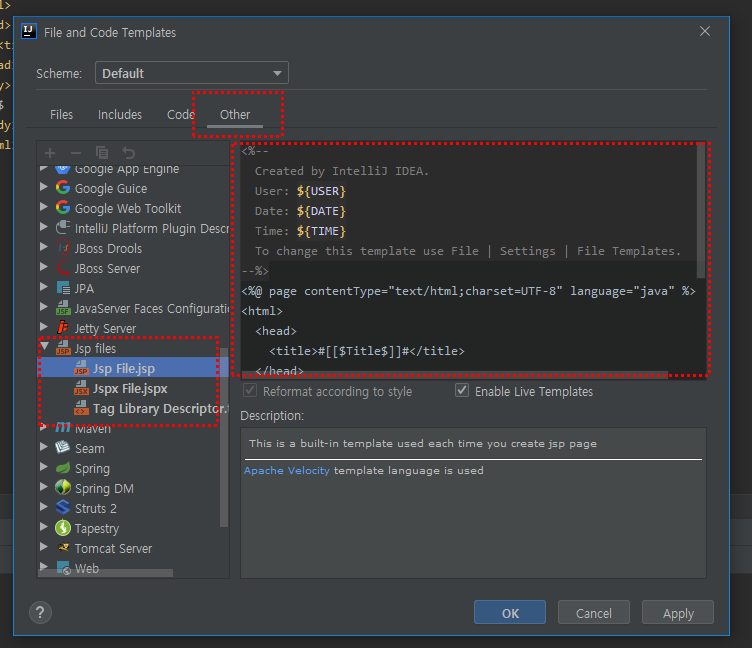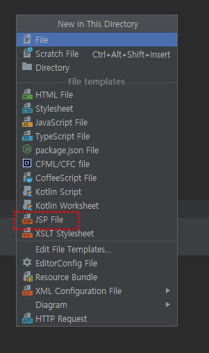 우클릭 > New > Edit File Templates 로 접속해서 JSP 템플릿 추가 및 파일 생성시 확인할 수 있다.