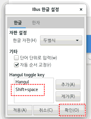 아래와 같이 설정하면 Shift+Space로 한영키를 변경할 수 있다.