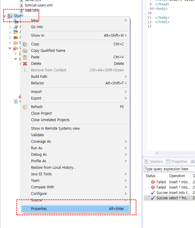 JSP 프로젝트 Properties로 이동