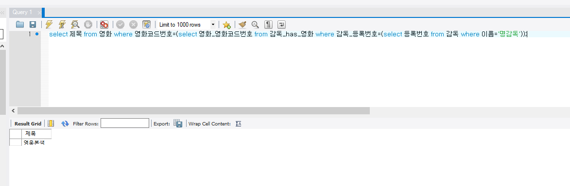 select 제목 from 영화 where 영화코드번호=(select 영화_영화코드번호 from 감독_has_영화 where 감독_등록번호=(select 등록번호 from 감독 where 이름='명감독'));